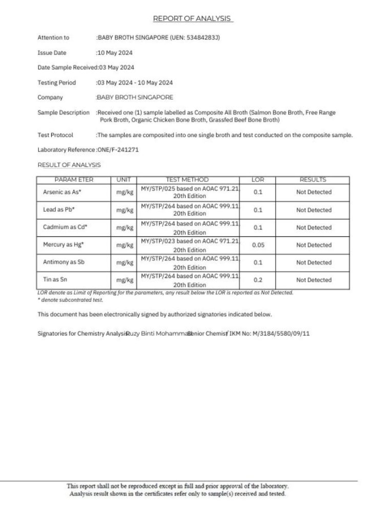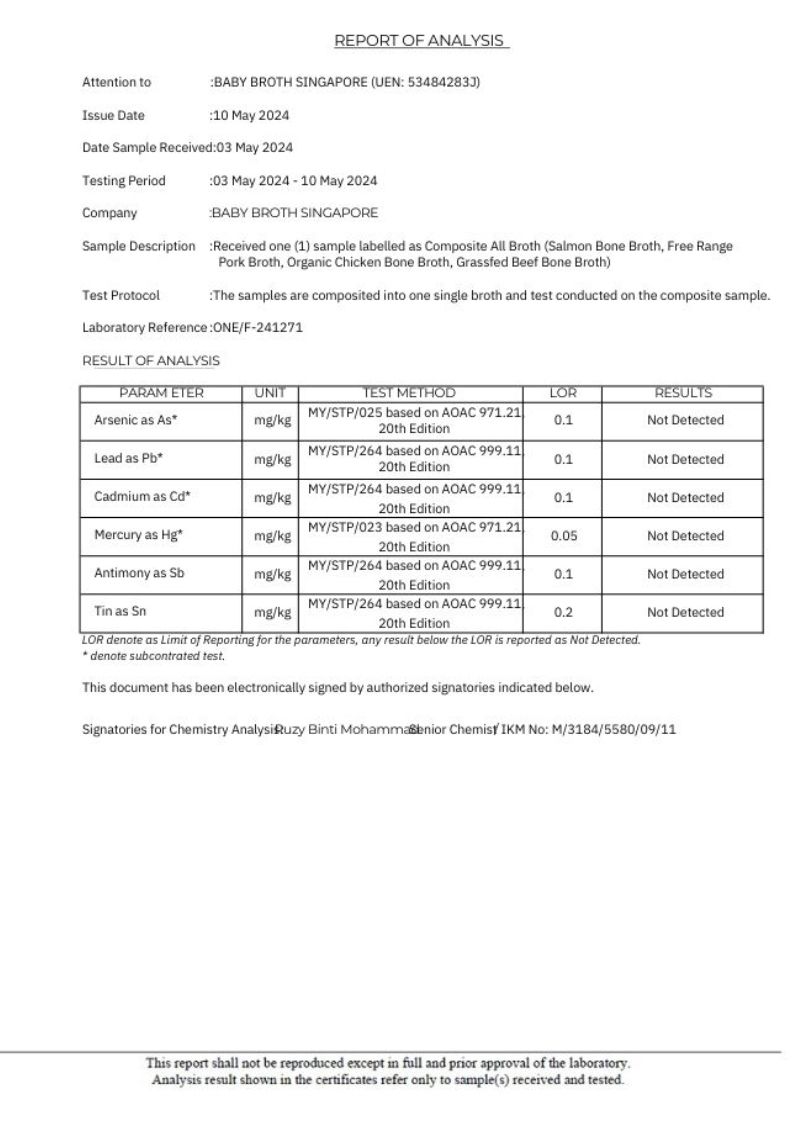A composite sample of all our broth variants—Salmon, Pork, Organic Chicken, and Grass-Fed Beef—was sent to an independent accredited laboratory for heavy metal analysis.