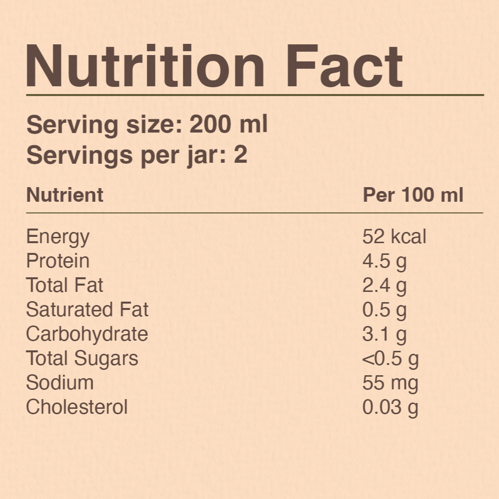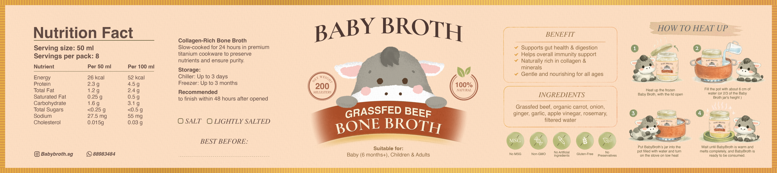 Only uses quality and premium ingredients, 100% solid and natural ingredients without any preservatives, chemical, NO salt and NO sugar added. Bone Broth had been slow cook for 24 to 48 hours by using 316Ti titanium cookware. At the optimal cooking temperature which is just high enough to extract only the good nutrition not the toxin from the bones which over simmering can cause.