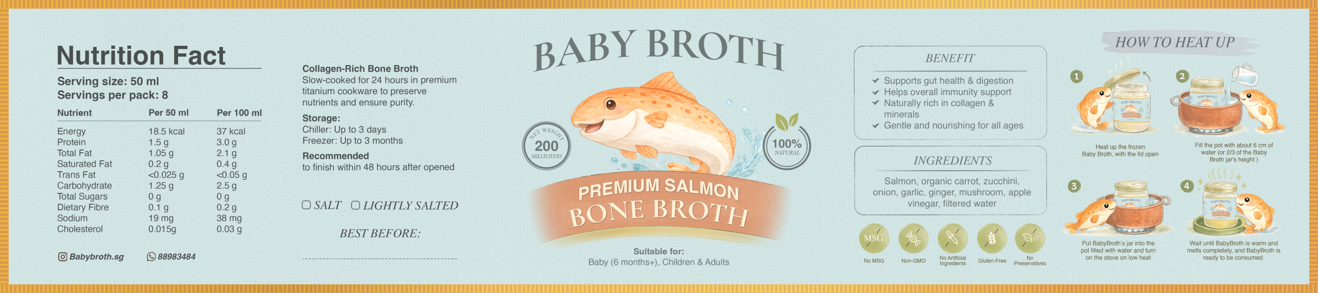 Salmon Bone Broth is an excellent source of minerals and nutrients and a wonderful way to get the most out of the whole fish. Fish bones, cartilage and fat are nutritious, containing extra-high levels of vitamin, omega fatty acids, iron, zinc and calcium. Using premium Salmon with Organic Vegetables slow cooked in 316Ti titanium stainless steel (to ensure no chemical leaching) at a low temperature for 24 hours to achieve a collagen-rich nutritious broth.